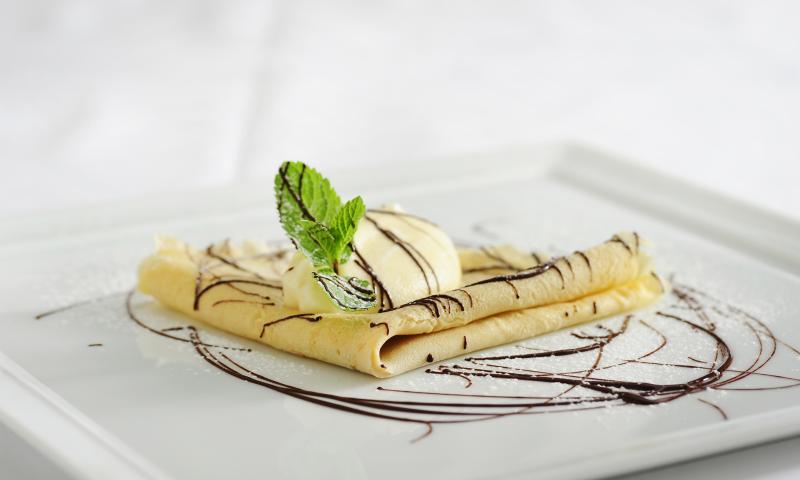 Melt the chocolate. Arrange the pancakes folded into triangles on warm plates, spoon melted chocolate over them and place a scoop of the baked apple sauce on the side of each plate. Garnish with mint leaves.