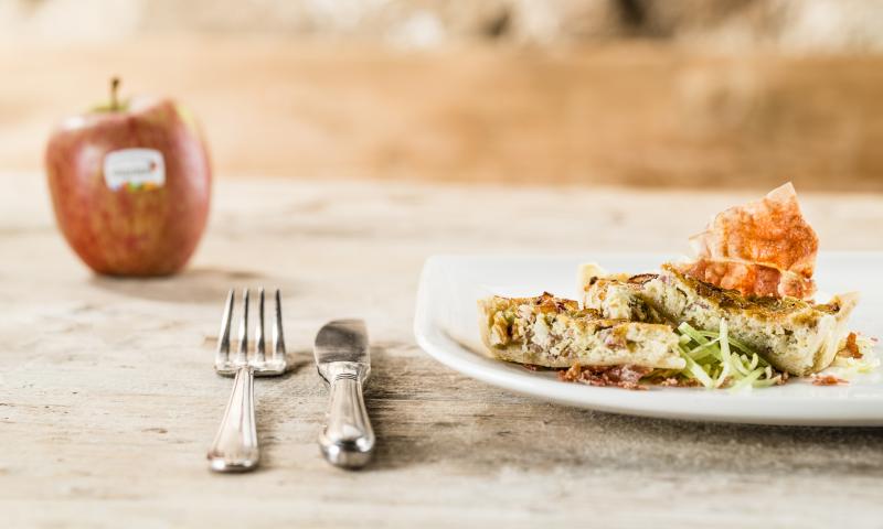 Fry the Speck in a pan for about 2 minutes. Add the leek to the pan and fry for another 5 minutes. Place in a bowl. Whisk the cream, eggs, apple, salt and pepper well and distribute over the dough along with the leek-Speck mixture.