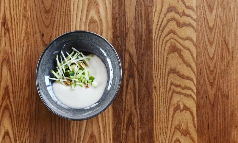 When serving, arrange the apple strips and apple pearls, the walnuts and the celery (cut into bite-sized pieces) with the dill on the plate. Pour the soup into bowls at the table so that it doesn’t get cold.