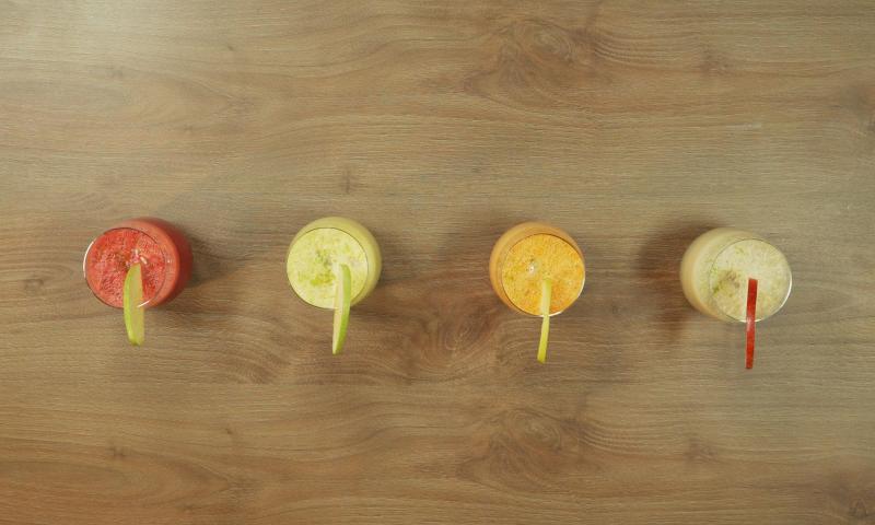 First wash the ingredients for the smoothie. Then put the peeled red beetroot and cored apples, peeled oranges, the mint and a lime through the juicer. Then add the natural yoghurt to the mixture.