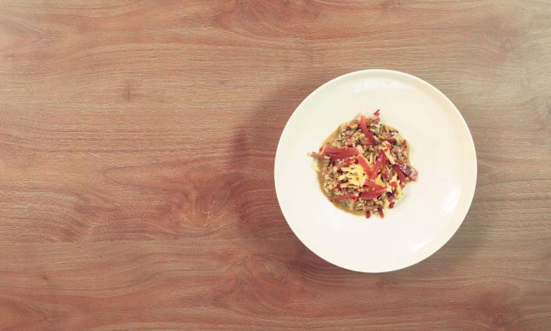 When serving, distribute the barley risotto on the plate and garnish with speck cut into strips.