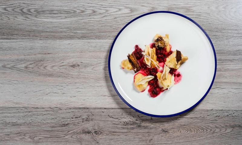 When serving, place an apple on the plate and the cranberries and milk chips on top.