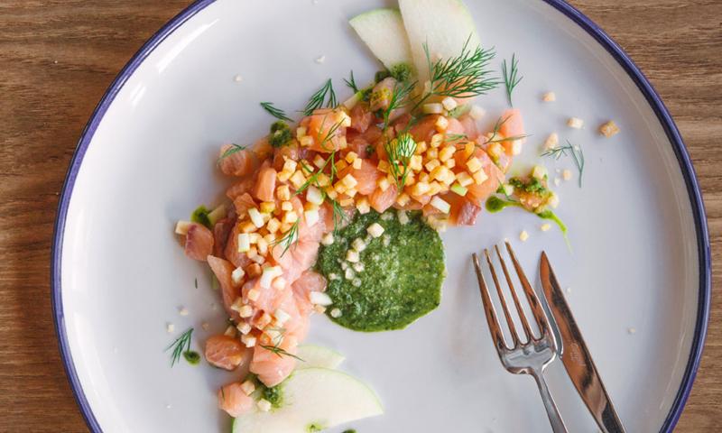 Skin the rainbow trout if necessary. Core the apple, remove the seeds from the chilli pepper and peel the shallot. Then dice everything finely. Mix the fish, apple, shallot and chilli pepper with salt, pepper and olive oil. If you like, add a dash of soy sauce.