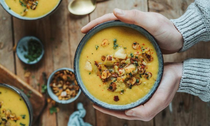 First clean the vegetables, peel them, and cut into large pieces. Peel and core the apples and also cut them into pieces. Chop the onion coarsely and fry in coconut oil, add the apples, and sauté. Add the remaining vegetables and sauté briefly, then deglaze with vegetable broth. Season with the spices and minced parsley and then boil for thirty minutes until the vegetables are done. If desired, puree, add almond milk, and season. Add additional spices as desired.