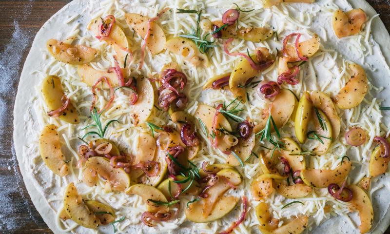 Finely slice the South Tyrolean apples and onions. Heat half of the olive oil and sweat the apples and onions. Add the rosemary and half of the herbs and sauté until the apples are soft. Set to one side. Combine the ricotta, the remaining olive oil and the other half of the herbs. Roll the dough out to a 20 x 30 cm rectangle. Top with the sauce, the ricotta and the cheese.