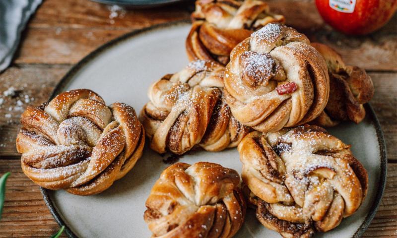 Roll the pastry out to a rectangle. Distribute the butter, cinnamon and sugar mixture evenly over half the dough and top with the diced apples. Fold over the other half of the dough and press down firmly. Slice the dough into strips of 2cm thick. Leaving one end intact, cut a slit into each strip, twist into a braid, and then wind the braid into a knot. Place on a baking tray. Whisk the egg and milk together and brush over the dough.