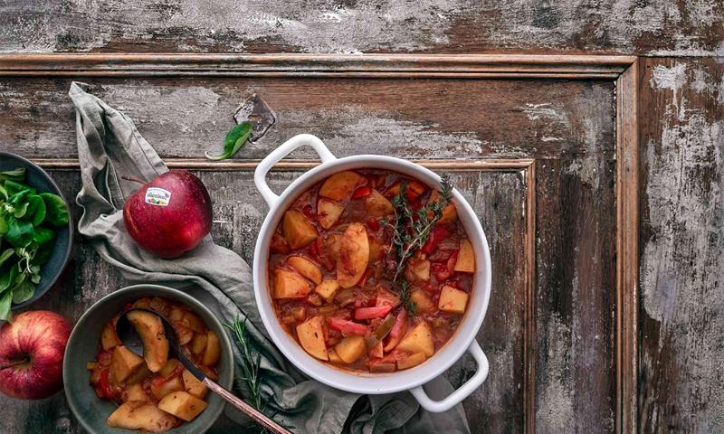 Peel the potatoes and apples. Chop the potatoes into bite-sized chunks, the apples into wedges.