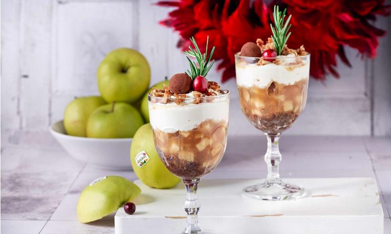 Tip: Cocoa-covered marzipan balls are the perfect decoration for this dessert. You can also add raisins to the chopped apple mix.